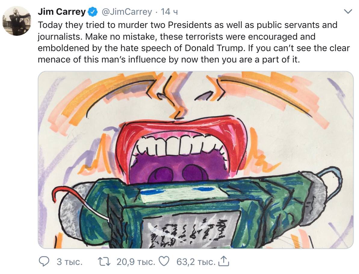 «Сегодня они попытались убить двоих президентов, а также государственных служащих и журналистов. Не ошибитесь, эти террористы вдохновились речью Дональда Трампа. Если вы не видите явной угрозы влияния этого человека, тогда вы – часть этой угрозы», – написал Джим Керри в на своей странице твиттере.