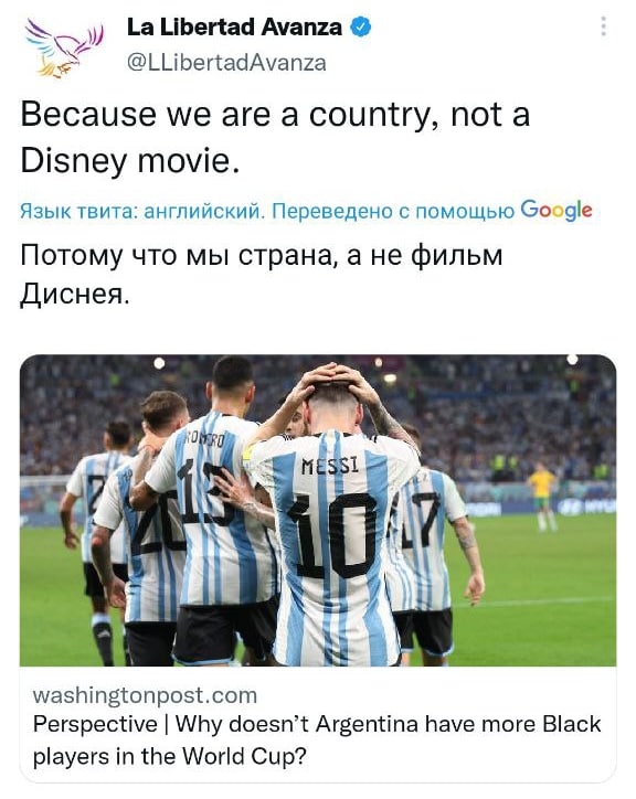 В Аргентине партия La Libertad Avanza церемониться не стала, и ответила в соцсети Илона Маска лаконично на претензии по поводу состава игроков сборной: “ Потому что мы страна, а не диснеевский мультфильм”