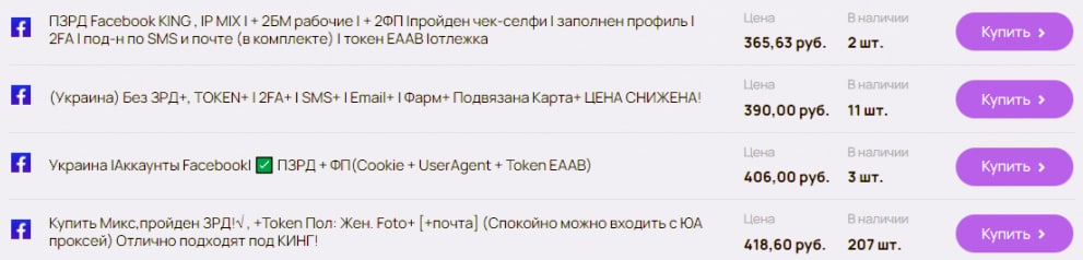 Итак. Большинство ботов, оставляющих комментарии под такими публикациями, привязывают аккаунт к фейсбуку (запрещен в РФ), что важно, страница с ПЗРД (прошедшая запрет рекламной деятельности). Подобные аккаунты потом сливаются оптом на серых сайтах (см. скрин). Что интересно, цены фиксированы в рублях, в виду того, что гривна не стабильна . И тут как говорил старик Веспасиан - “деньги не пахнут”.