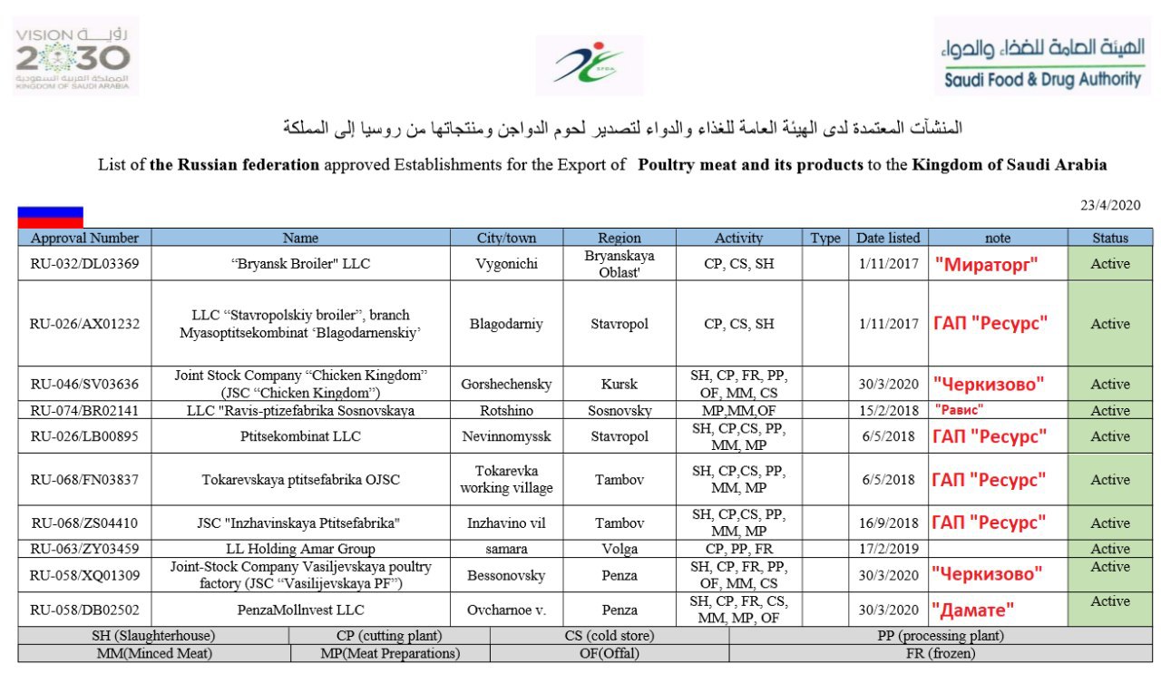 Саудовская Аравия требует от поставщиков мяса птицы большей безопасности продуктов. С 1 ноября этого года королевство ужесточит требования к сертификации халяль. Сопровождать поставки в Саудовскую Аравию, нужно будет сертификатом SFDA (Управление по санитарному надзору за качеством пищевых продуктов и медикаментов СА), который выдан либо самим SFDA, либо аккредитованным им органом.