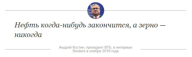 Если кто не понял, о чём этот сигнал, поясняем. В России и в мире начался глобальный передел экономики. Меняются правила игры. Подходит к закату нефтяная эпоха. Как говорит глава ВТБ Андрей Костин: "Нефть закончится, а пшеница - никогда".