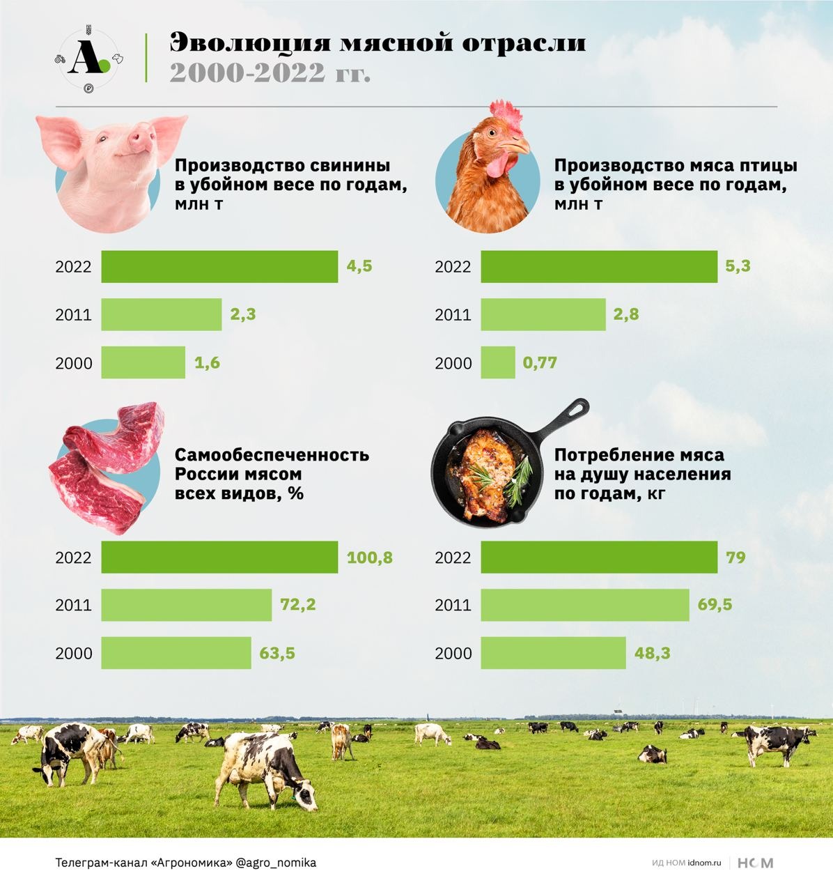 В четвертой части спецпроекта рассказываем о наиболее сложной и инерционной отрасли сельского хозяйства — производстве мяса. В 90-е производство всех видов мяса в России полностью деградировало. По объемам выпуска отрасль откатилась к уровню 60-х годов. Поголовье КРС упало с 57 млн в 1990 г. до 27 млн в 2000 г., свиней — с 38,3 млн до 15,8 млн, кур — с 457 млн до 340 млн. Зависимость от импорта достигла критических значений.
