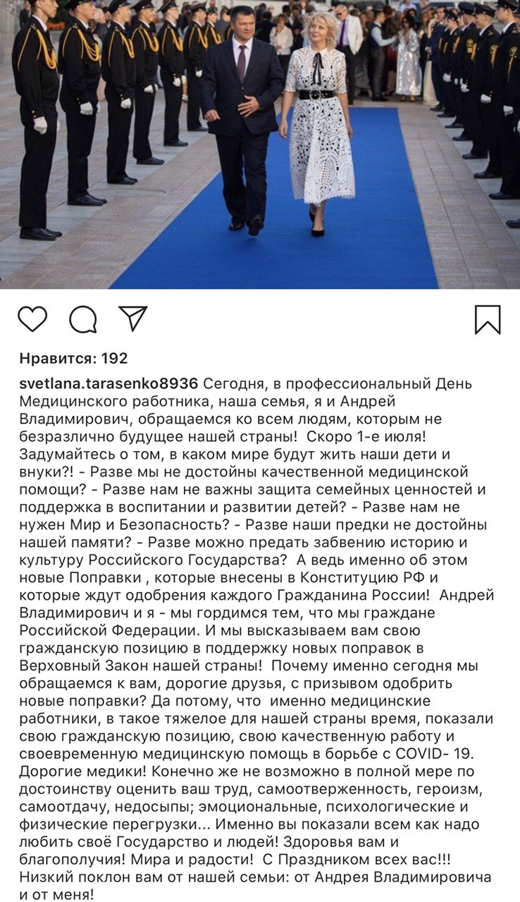 Супруга экс Врио губернатора Приморья Андрея Тарасенко Светлана поздравила медицинских работников с профессиональным праздников, призвав всех одобрить новые поправки в «Верховный Закон нашей страны».