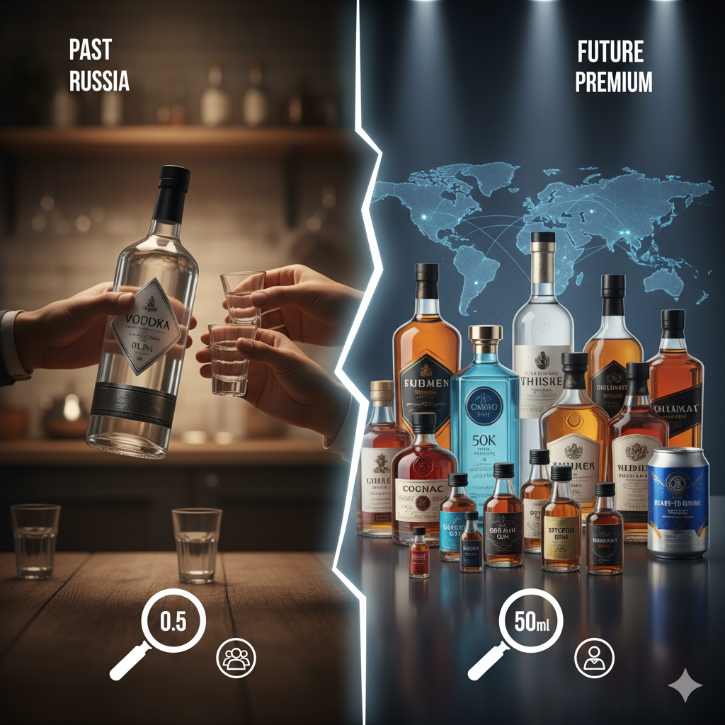 • Смена фокуса: Борьба на рынке смещается с объёмов на формат потребления. Актуальны: 0,5 л как «народная норма», 0,7 л+ как «выгодная/премиум покупка» и 0,05-0,375 л как «индивидуальная доза» или удобная порция.