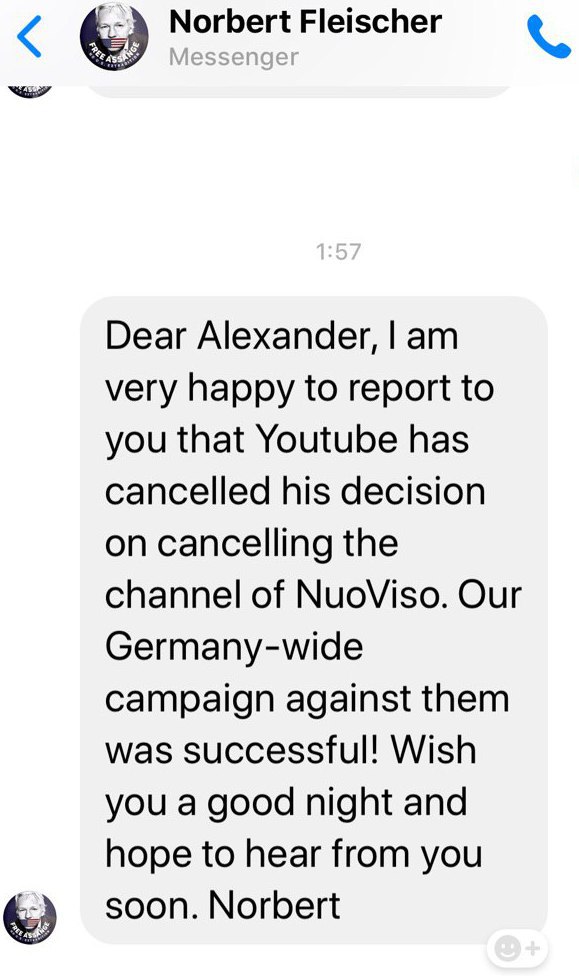 И вот: ночью стало известно о блокировке Youtube-канала журналиста Норберта Флейшера (Norbert Fleischer) NuoViso.TV – того самого, на котором и вышло тогда мое интервью.