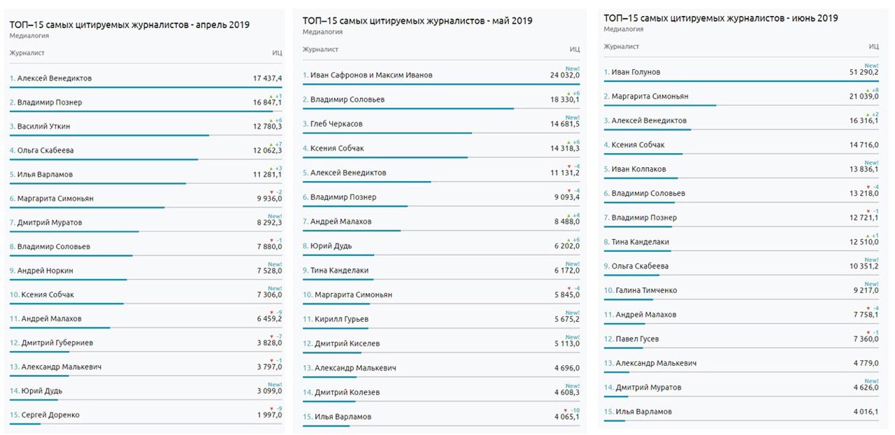 Лидером медиарейтинга в апреле был Алексей Венедиктов; он сообщил, что журналист и писатель Дмитрий Быков находится в реанимации и информировал о его состоянии. В мае рейтинг возглавили Иван Сафронов и Максим Иванов, уволенные из «Коммерсанта». В июне, конечно, всех «порвал» журналист-расследователь Иван Голунов.