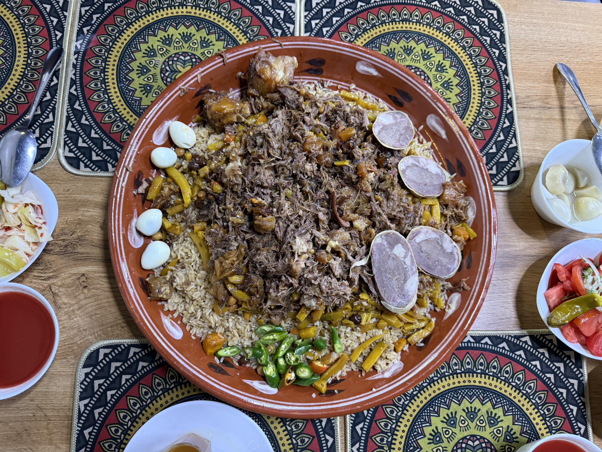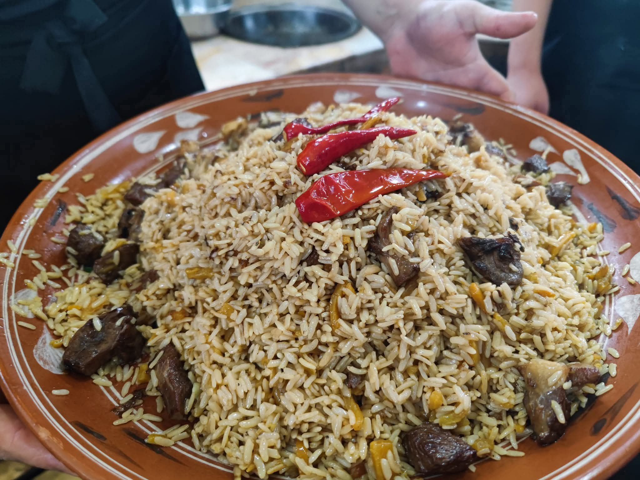 Риштанский плов от гончара Бахтиёра Назирова был великолепен. Рис рассыпчат, желтые искры моркови, мясо сочное, нежное, аромат жареной думбы и зиры.