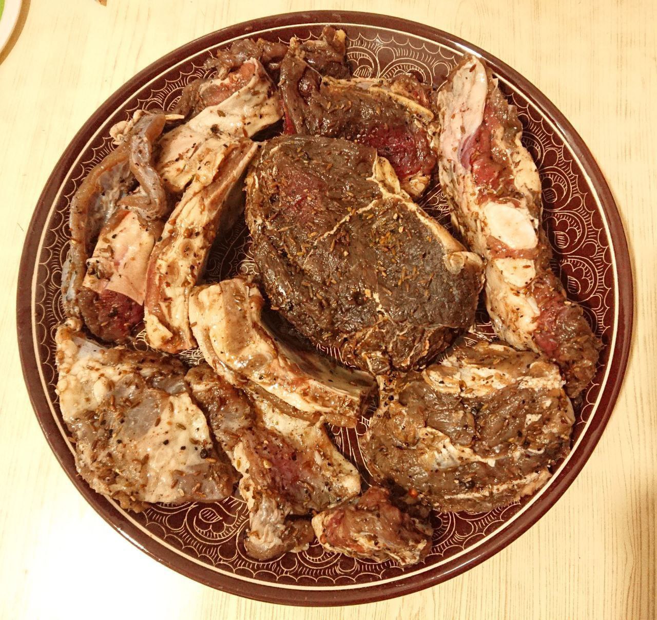 На фото говяжья и баранья грудинка с рёбрами, конское филе, только просолено.