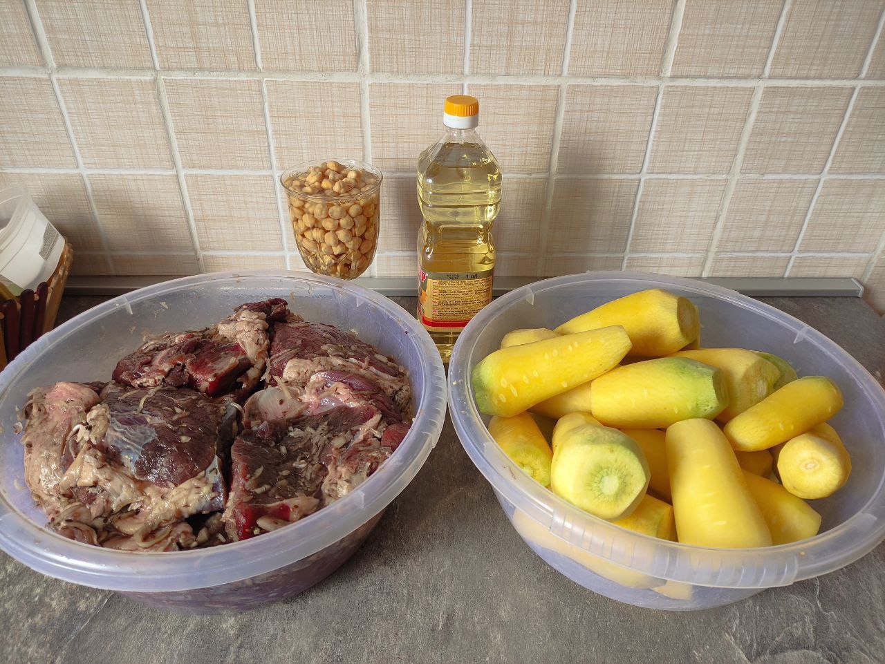 ~ 5 луковиц, 2 кг желтой, уже порезанной моркови