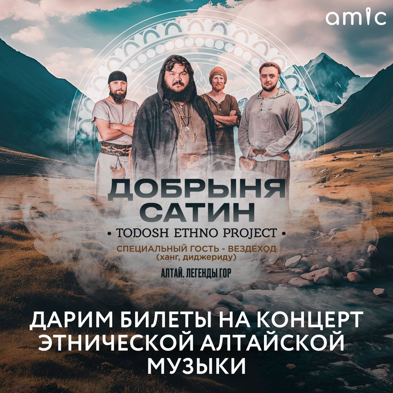 Amic.ru | Новости Барнаула и Алтайского края | Амик.ру | Амител pinned «⛰️ 25 ноября в Барнауле пройдет концерт этнической алтайской музыки. И мы хотим подарить вам два билета! Для барнаульцев выступит Добрыня Сатин, этно-проект Todosh и Вездеход в программе «Алтай. Легенды гор» 🎶 Добрыня Сатин — яркий представитель жанра…»