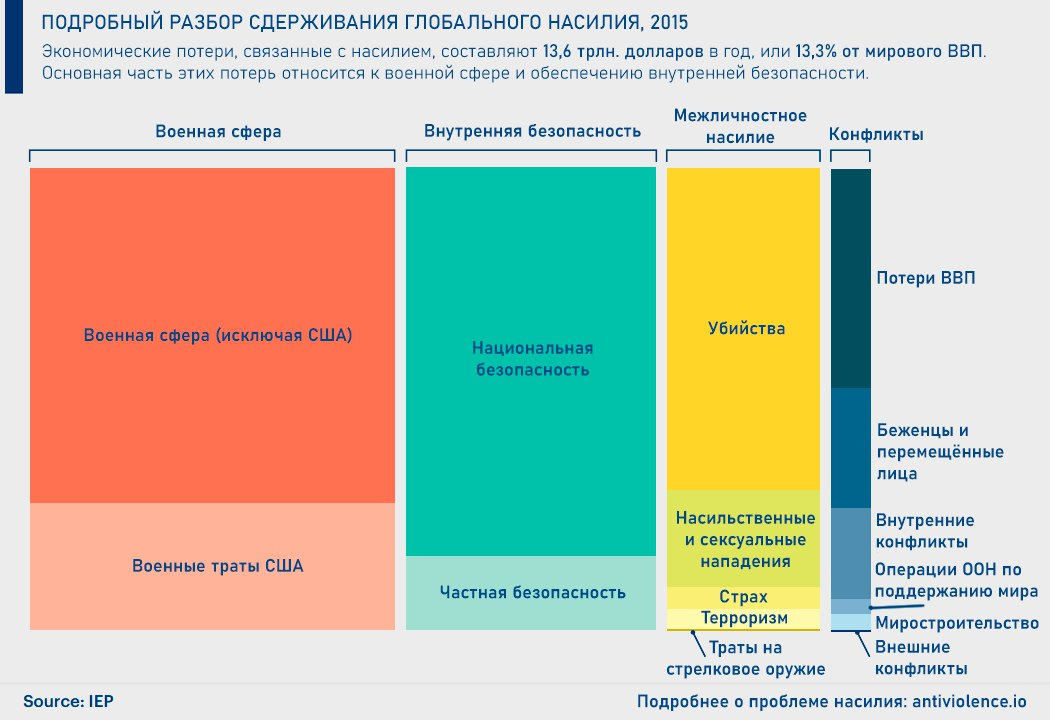 В 2017 году Институт экономики и мира выпустил отчёт, в котором была проведена комплексная оценка мировых экономических потерь от деятельности, нацеленной на «сдерживание, предотвращение и ликвидацию последствий насилия». Как оказалось, насилие нам обходится в 13,6 трлн. долларов в год или 13,3% от мирового ВВП (оценка дана за 2015 год). Чтобы представить это в перспективе, 10-процентное сокращение экономического воздействия насилия высвободит больше средств, чем общая стоимость мирового экспорта продовольствия или общий объём глобальных прямых иностранных инвестиций в 2014 году. Это гигантские значения.