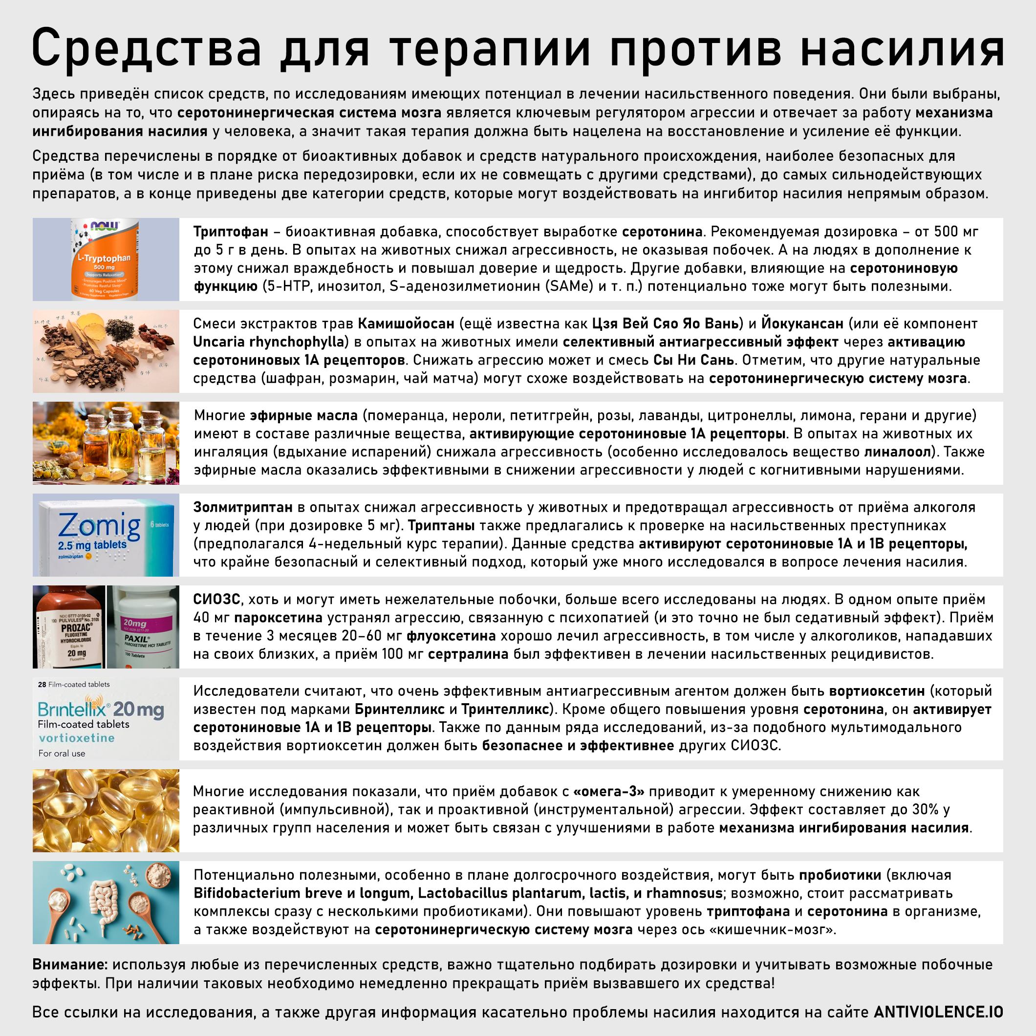В конце отметим и некоторые другие примеры. Так, приём «омега-3» приводит к умеренному снижению как реактивной (импульсивной), так и проактивной (инструментальной) агрессии, что может быть связано с улучшениями в работе ингибитора насилия. Вещества, воздействующие на 5-HT1A рецепторы, имеются и в составе эфирных масел, ингаляция которых оказалась эффективной в снижении агрессивности у людей с когнитивными нарушениями. Также уже изучается возможность использования пробиотиков (бифидобактерий и лактобактерий), участвующих в метаболизме триптофана и серотонина в организме, для терапии насильственного поведения.