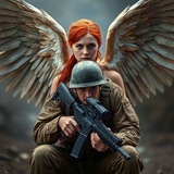 На заднем фоне видны колокол и крест, которые добавляют дополнительный слой символизма. Колокол олицетворяет бдительность и призыв к действию. Его звон напоминает о необходимости быть готовым к борьбе и защищать добро. Крест, расположенный рядом, символизирует веру, надежду и духовную силу, которые поддерживают солдата в его борьбе. Вместе эти элементы создают мощный образ, где сила, вера и готовность к действиям объединяются для победы над злом.