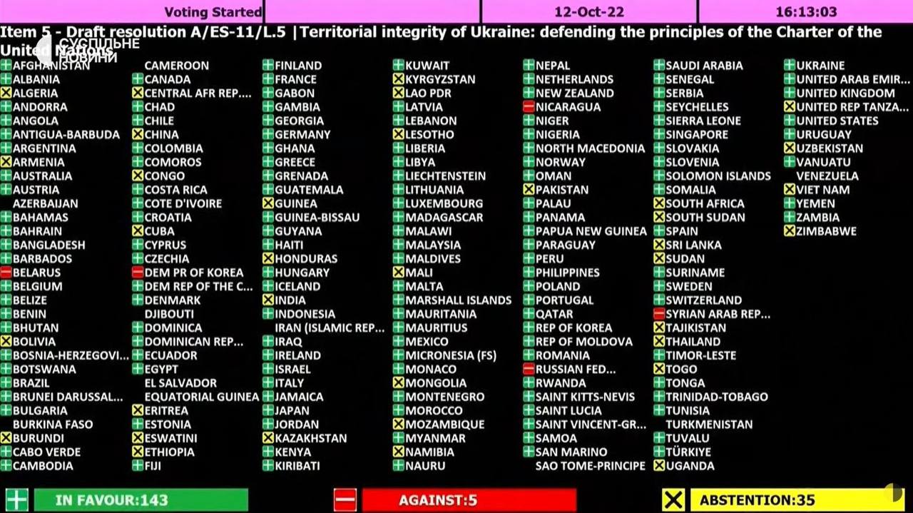 Наконец, посредник и примиритель голосует за резолюцию о непризнании референдумов о вхождении в состав РФ Донецкой, Луганской народных республик, Херсонской и Запорожской областей.