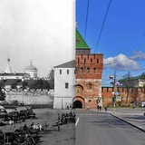 В 1950-е годы стены и башни Кремля были реконструированы из-за ветхости. Потому старинный и современный кадры по левому краю так различаются. В остальном всё более или менее сохранилось. На втором плане Кадетский корпус и шатёр старейшего собора Михаила Архангела. На дальнем плане слева видна колокольня Спасо-Преображенского собора. На современной фотографии — воссозданная в 2021 году копия.