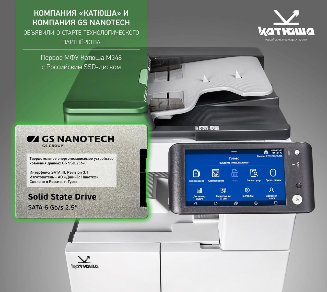 ГК «КАТЮША» и GS Nanotech объявили о старте технологического партнерства, в рамках которого устройства «КАТЮША» получат российские SSD (твердотельные накопители), производящиеся в г. Гусеве Калининградской области. Применение накопителей GS Nanotech в устройствах «КАТЮША» обеспечит информационную безопасность и высокую скорость передачи данных. Российская Экосистема печати «КАТЮША» первой на рынке представила МФУ с отечественными SSD.