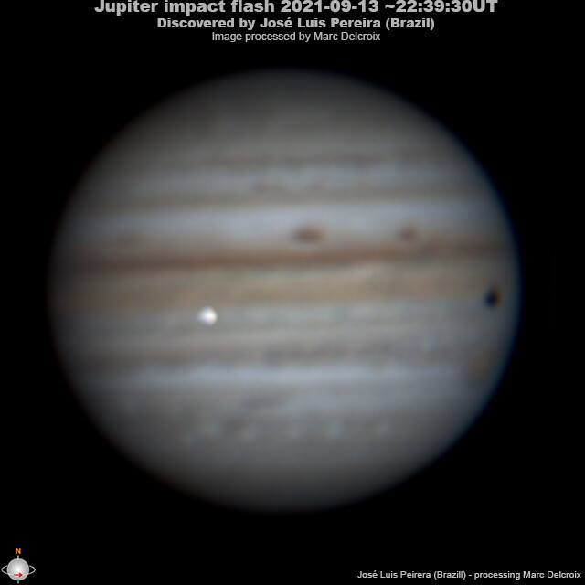 Астрофотограф из Бразилии Жозе Перейра снял яркую вспышку на Юпитере (результат столкновения с небесным телом) в районе экватора планеты. Событие произошло сегодня, 14 сентября, около 01:39:30 МСК/по Киеву. Очень маловероятно, что в верхних слоях юпитерианской атмосферы останутся следы падения, но если вы снимали примерно в это же время, то все равно стоит проверить свои снимки.