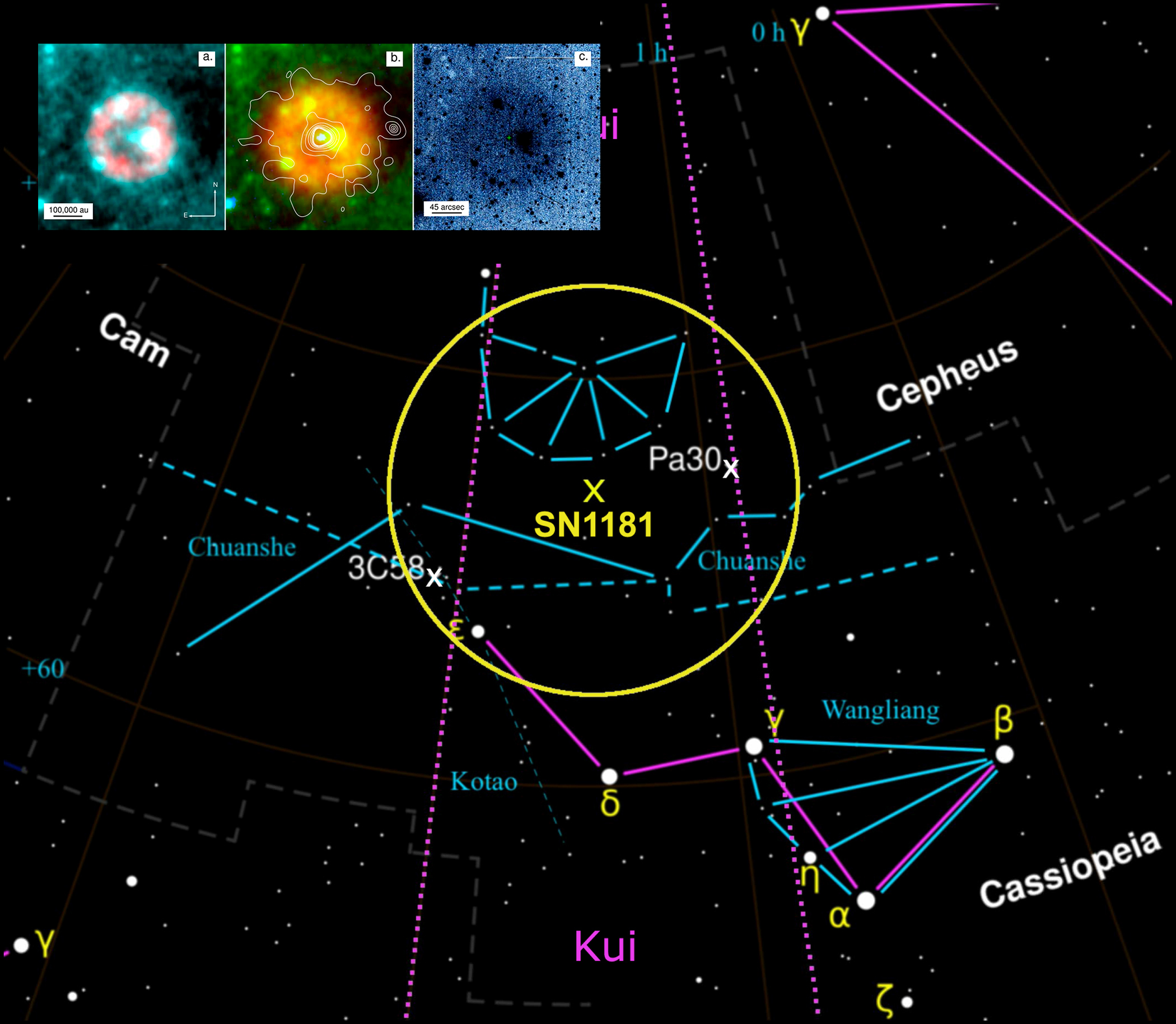 Изображение — карта с отмеченным положением туманностей Pa 30 и 3C58. Желтым крестом показана наилучшая оценка среднего положения Сверхновой 1181 года. На вклейке: инфракрасное (а), ультрафиолетовое (b) и оптическое (с) изображения туманности Pa 30.