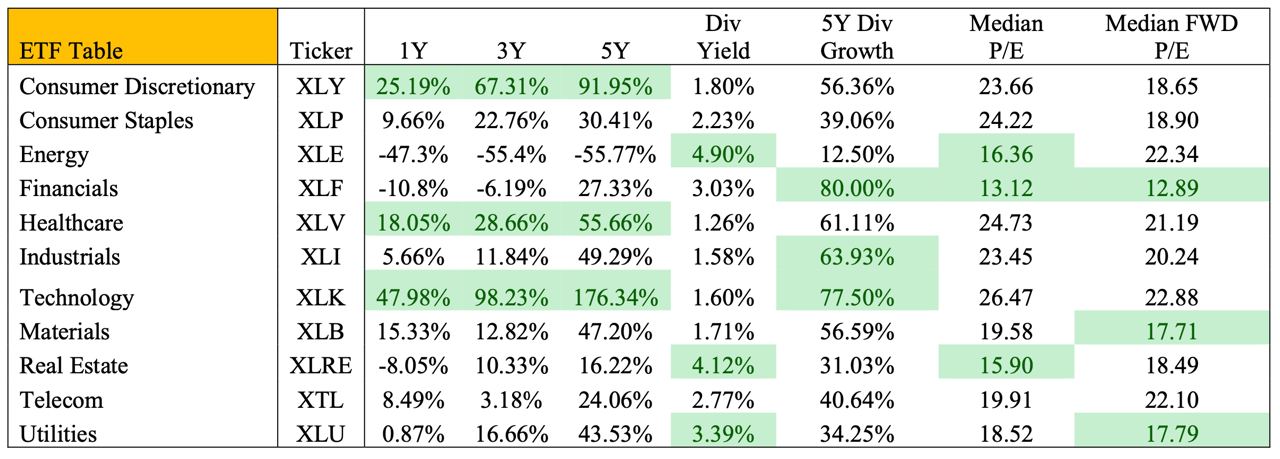 Чтобы исправить данный досадный пробел, наши лучшие аналитики невероятным трудом составили для вас список всех секторов индекса snp500. В таблице ниже вы сможете найти их перформанс за 1-3-5 лет, а также (чисто для прикола) четыре колонки про дивиденды и P/E.
