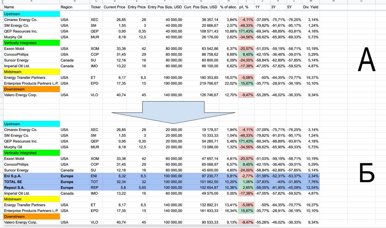 Главное правило: все действия с вашим портфелем это переход из состояния А к состоянию Б в рамках какой-то цели. В приведенном примере (см. картинку) этой целью будет диверсификация нефтяного портфеля в сторону Европы.