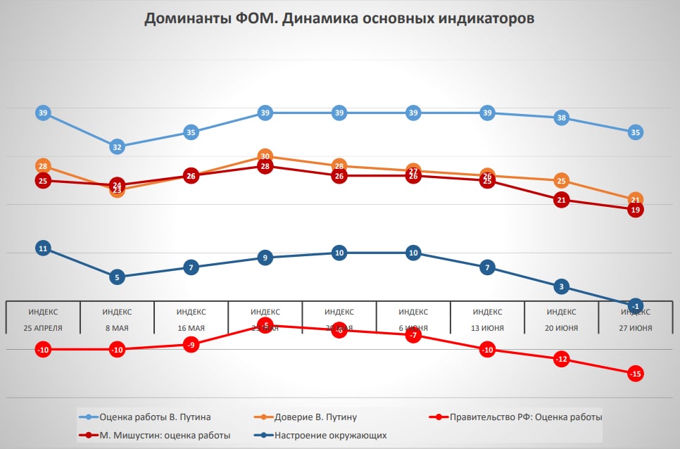 График основных индикаторов (индексов) власти демонстрирует снижение. К привычно негативной картине оценок работы Правительства РФ прибавилась негативная динамика рейтингов (оценка работы и доверие потеряли по два пункта каждый) президента Путина. Также произошло снижение электорального рейтинга «Единой России» — 29% желающих проголосовать (на три пункта меньше предыдущего значения). Плюс один пункт у КПРФ — 13%.