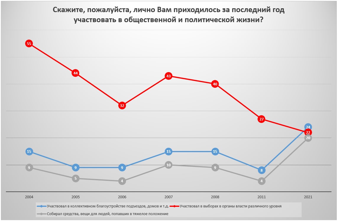 Но общество не замечает прямой зависимости отказа от политической активности и снижением уровня жизни/ростом количества благоустраивающих свои подъезды. У него на это нет времени — 28% опрошенных (принималось два варианта ответа), оно считает, что «политикой должны заниматься профессионалы» — 20%, граждане доверяют президенту и считают, что он сам решит все проблемы в стране — 19%. И как же без двух вечных тем: «моё участие ничего не изменит» — 16% и «мне это не интересно» — 15%.