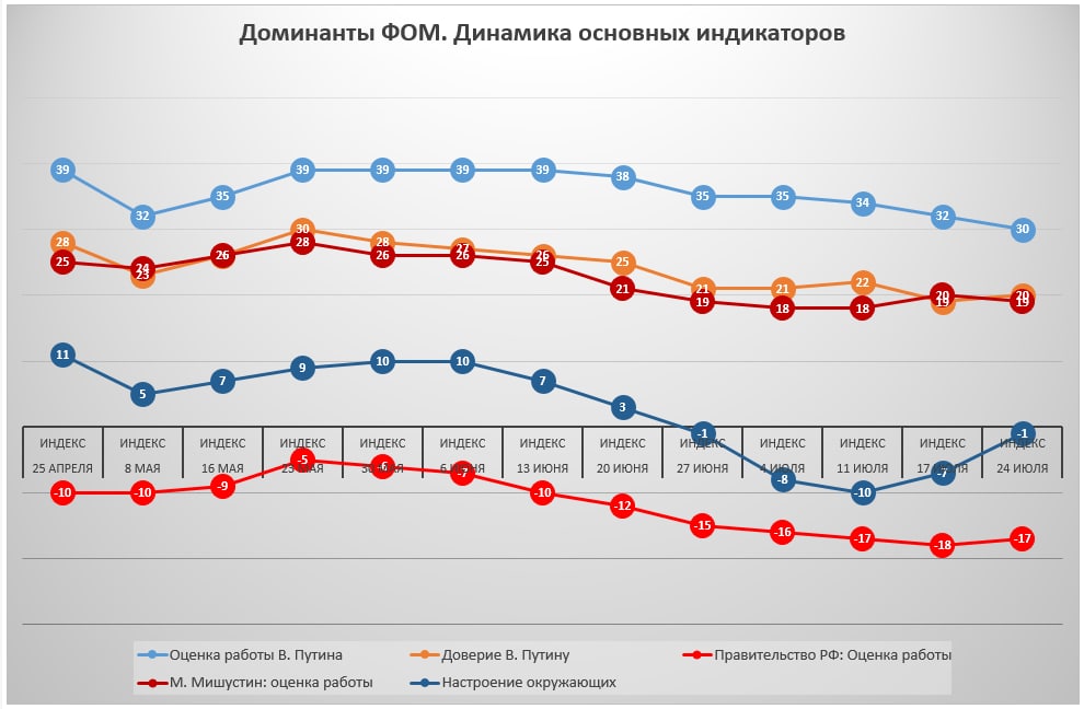 Впереди август, месяц традиционно сложный для России. Смотрим за настроениями в обществе — продолжение тренда на восстановление спокойствия или его кардинальная смена во многом предопределят оценки работы власти.