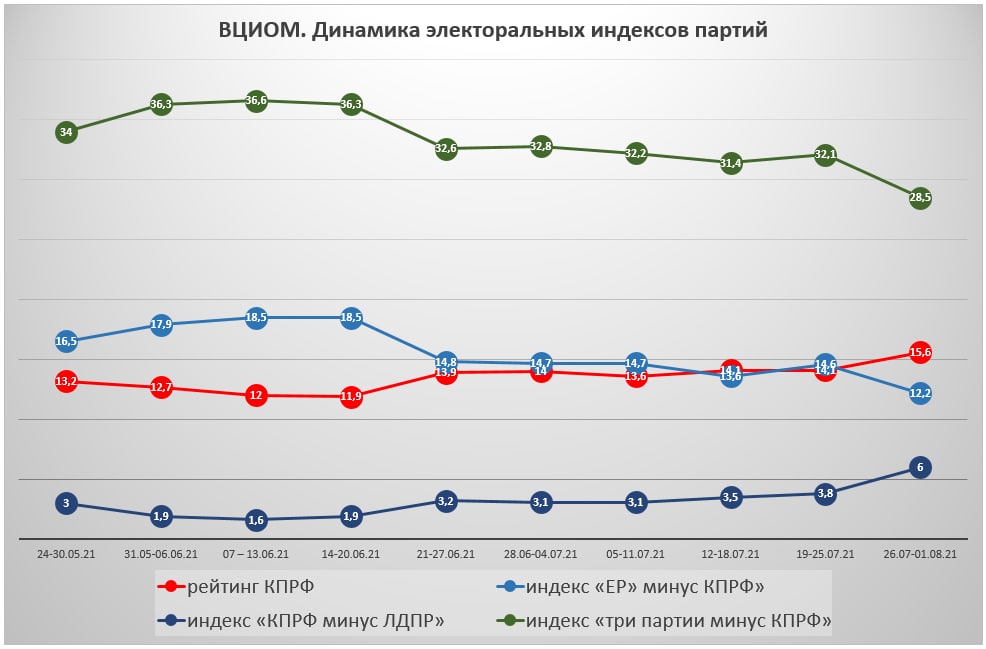 Начнём с электоральных рейтингов. Глядя на них, понятна обеспокоенность политадминистраторов и возникновение разговоров о «силовом» решении вопроса с КПРФ — снять с выборов в ГД-8 весь федеральный список партии. КПРФ не просто единственная парламентская партия, чей рейтинг вырос за лето — плюс 2.4 пункта относительно данных за 30 мая. Более того, похоже что КПРФ забирает голоса у всех остальных парламентских партий.