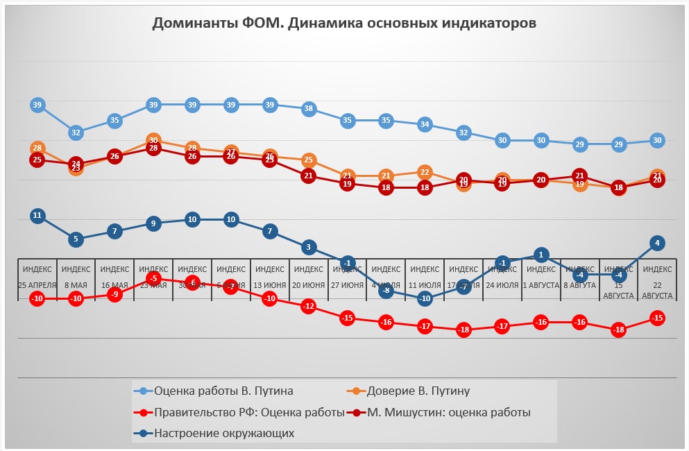 Фиксируется рост на 3 пункта индекса «доверия В. Путину». Несмотря на то, что число доверяющих изменилось незначительно — плюс 1 пункт, но на 2 пункта уменьшилось число не доверяющих. Индекс «оценки работы В. Путина» прибавил 1 пункт, за счёт снижения числа негативных оценок. Аналогично, выросли оценки работы и Правительства РФ, и премьера М. Мишустина. В позитивную зону перешёл и индекс «настроения окружающих».