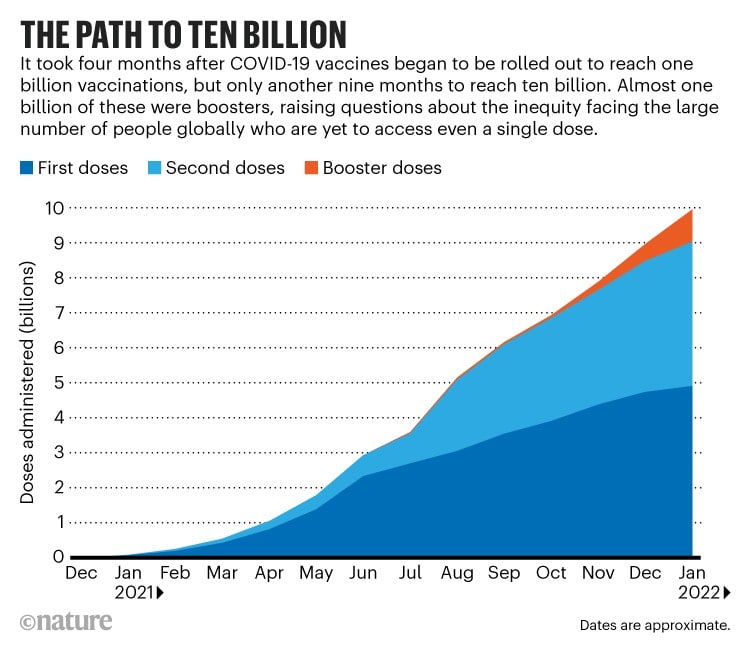 Nature пишет, что общемировое количество вакцинаций достигло 10 миллиардов и как минимум 4.8 миллиарда человек (примерно 60% населения мира) получили одну дозу одной из более чем 20 различных одобренных вакцин.