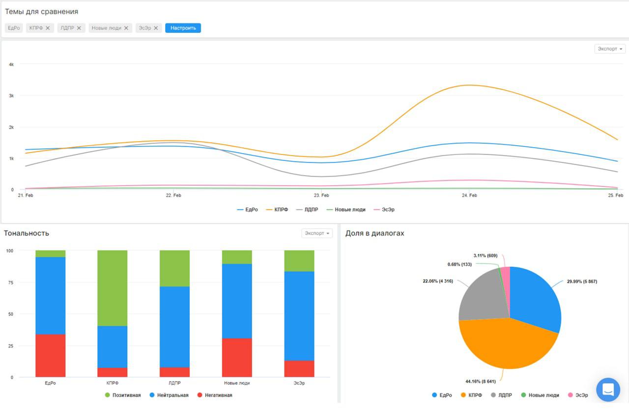 Анализ тональности и количество постов показывают, что (1) для КПРФ эта тема оказалась наиболее выраженной — максимальное количество сообщений, среди всех парламентских партий и максимально позитивной по тональности; (2) относительно неплохо выглядит ЛДПР — думается, что при здоровом Жириновском результат был бы лучше.