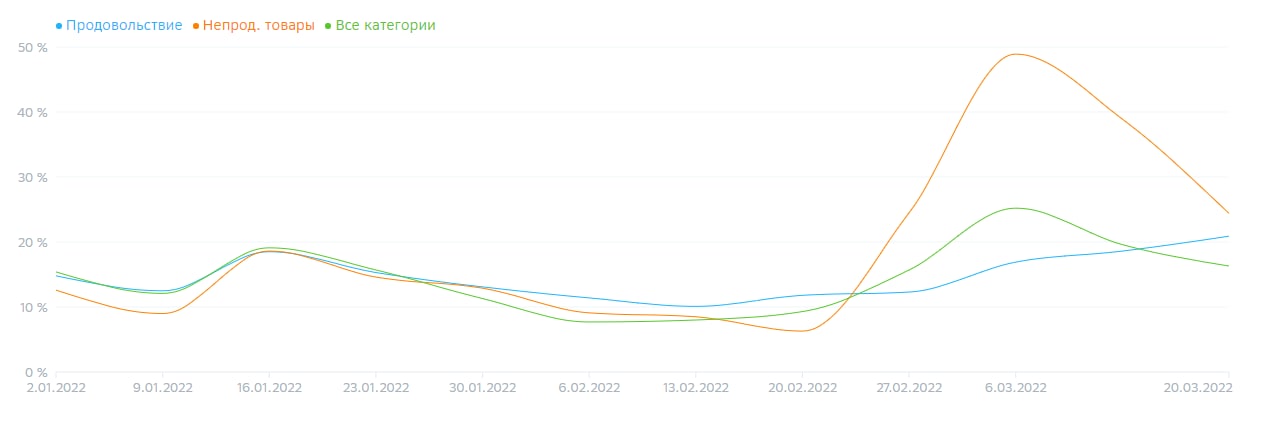 Потребление в группе непродовольственных товаров снижается — с пика 48.9% от 6 марта до 24.4% на 20 марта. Напомню, этот рост был в первую очередь связан с бумом продаж бытовой техники, в период с 27 февраля по 6 марта.
