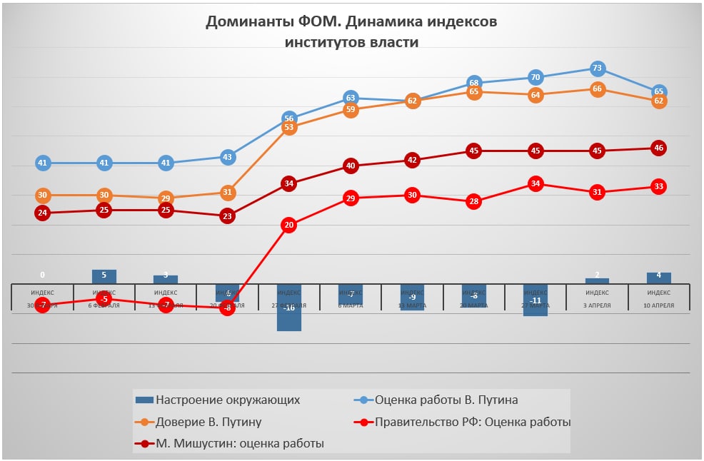 Индексы рейтингов президента В. Путина показывают что-то, похожее на коррекцию после достижения максимумов. Индексы оценки работы премьера М. Мишустина и кабинета министров немного подросли, но в целом, напоминают плато. Настроение россиян вышло в позитив, критика и возмущение действиями власти отсутствуют.