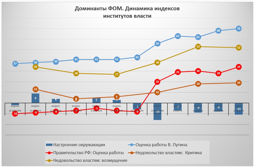 Процесс консолидации общества и власти продолжается (фиксируется рост индексов институтов российской власти) на фоне негативной динамики настроений россиян. При этом, негатив не конвертируется, ни в критику, ни в возмущение действий властей.