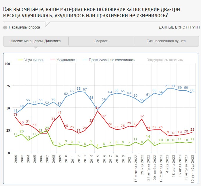 То есть, в массе своей, российское общество достаточно быстро адаптируется к ухудшению социально-экономической обстановке в стране — об этом говорит перетекание %% между группами «ухудшилось» и «не изменилось» при минимальных изменениях доли тех, у кого материальное положение «улучшилось».