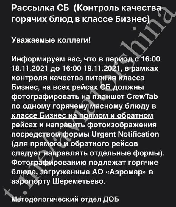 Старшим бортпроводникам предписано в течение суток с 16:00 18 ноября по 16:00 19 ноября фотографировать по одному горячему мясному блюду в бизнес-классе на всех прямых и обратных рейсах. Фотографированию подлежат горячие блюда, загруженные кейтеринговой «дочкой» «Аэрофлота» — компанией «Аэромар» в аэропорту Шереметьево.