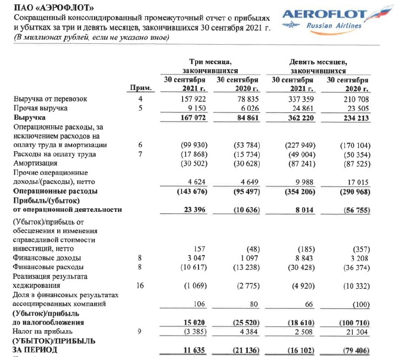 — Чистая прибыль группы «Аэрофлот» в июле-сентябре по международным стандартам финансовой отчётности (МСФО) составила ₽11,6 млрд. Квартальная чистая прибыль была получена впервые за два года;