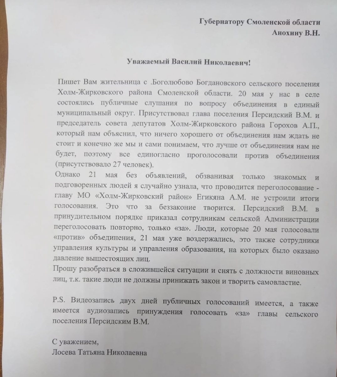 "Ничего хорошего от объединения нам ждать не стоит". В соцсетях распространяется письмо к губернатору Смоленской области от жительницы Холм-Жирковского района. В нем она утверждает, что на публичных слушаниях в Богдановском сельском поселении по вопросу создания муниципального округа 20 мая все присутствующие проголосовали против объединения поселений. Однако 21 мая, якобы из-за недовольства главы района Ашота Егикяна, было устроено некое "переголосование". Если все так и было, документ вызывает ряд вопросов: