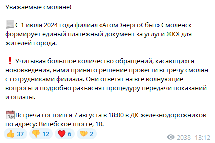 Похоже, встреча представителей "АтомЭнергоСбыта" с жителями Смоленска - это попытка сделать хорошую мину при плохой игре. Только вдумайтесь. Было несколько месяцев подготовки к переходу на новую схему расчетов. Прошло больше месяца с 1 июля, когда "АтомЭнергоСбыт" начал "формировать единый платежный документ". Все это время никто не хотел встречаться со смолянами и разъяснять предстоящие перемены. Желание организовать сеанс коллективного общения (точнее - спустить пар) возникло только тогда, когда жители получили квитанции с непонятными и завышенными начислениями.