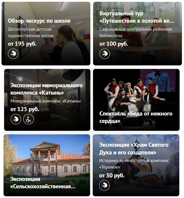 Например, Сафоновская центральная районная библиотека предлагает виртуальный тур "Путешествие в золотой век культуры Сафоновской земли" стоимостью от 100 рублей. А в Десногорске можно посетить платную обзорную экскурсию по детской художественной школе. Стоимость мероприятия составляет от 195 рублей. Причем посещение экскурсии по художественной школе оценивается в полтора раза дороже, чем, например, экспозиции в мемориальном комплексе "Катынь" (125 рублей), и в несколько раз дороже экспозиций историко-архитектурного комплекса "Теремок" (30 рублей).