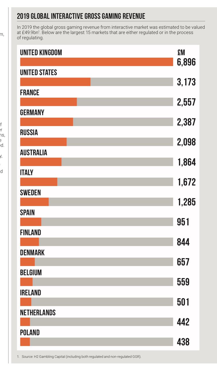 На изоляции, в карантине, начал исследовать годовые отчеты больших западных букмекеров. Это отчет 2019 года с оценкой рынка. Посмотрите, как высоко котируется Россия! Дальше будет еще пара интересных скриншотов по рост рынка, доли и пр.