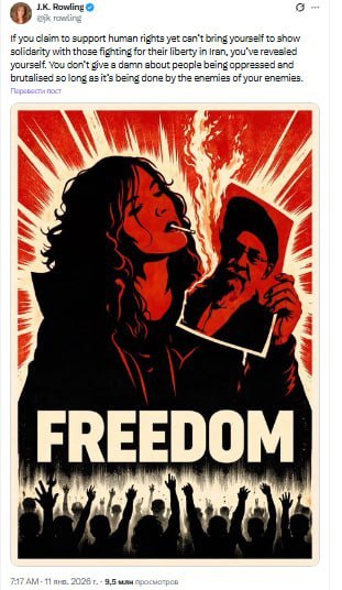Автор серии книг о Гарри Поттере, британская писательница Роулинг, выступила с резкой критикой правозащитных активистов, обвинив их в лицемерии и избирательном подходе к правам человека на фоне протестов в Иране. Её публикация в соцсети X стала вирусной, собрав более 9 млн просмотров. По словам Роулинг, многие движения, громко осуждающие Запад, демонстративно игнорируют иранских протестующих, выступающих против репрессивного режима.