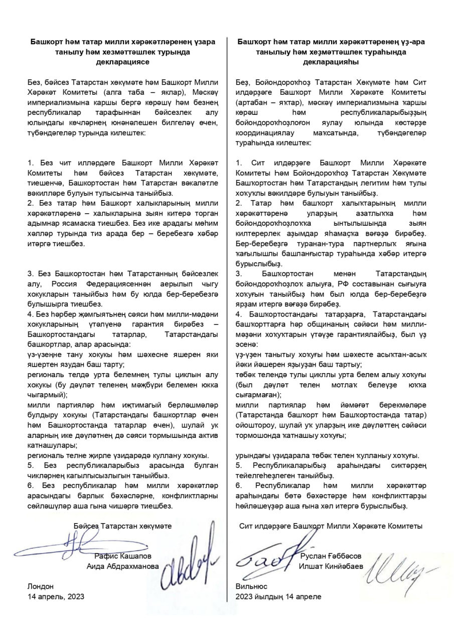 Правительство Татарстана в изгнании во главе с Рафисом Кашаповым и Комитет Башкирского национального движения за рубежом во главе с Русланом Габбасовым подписали совместную Декларацию о взаимном признании и сотрудничестве (ТГ-канал Лига Свободных Наций).