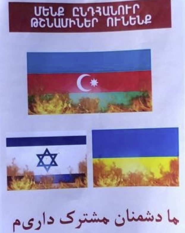Раввин общины грузинских евреев в Баку Замир Исаев разместил на своей Twitter-странице еще одну (до сих пор не публиковавшуюся) фотографию листовок, распространяемых в Ереване, с "сожжением" флагов Азербайджана, Украины и Израиля, в сопровождении надписей на армянском и фарси: "У нас общие враги".