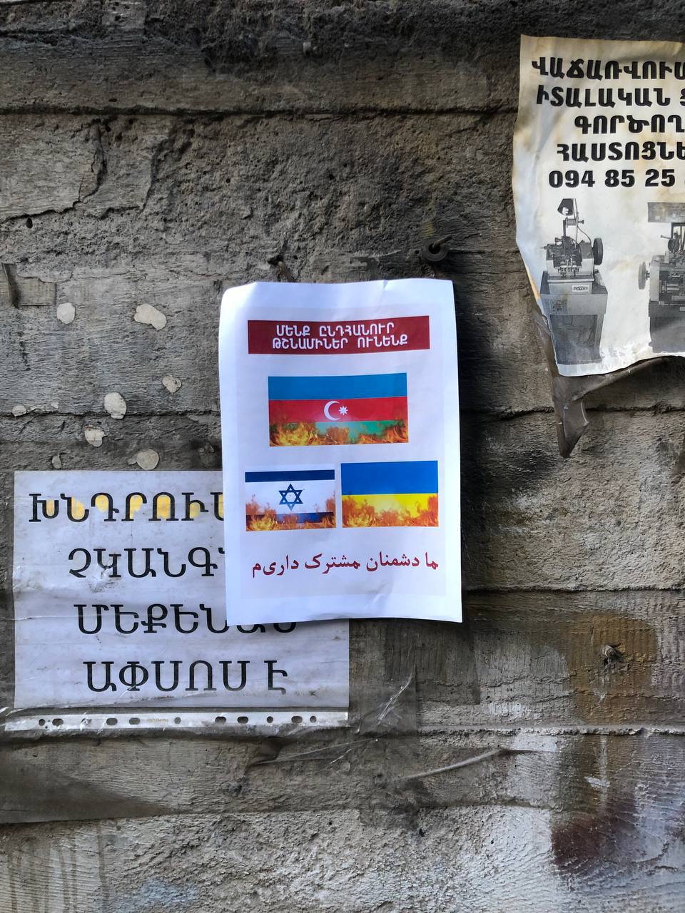 Вчера украинский Цензор.НЕТ сообщил о распространении по всему Еревану, в том числе на центральной площади столицы, листовок, изображающих сожжение флагов Украины, Израиля и Азербайджана. Над и под иллюстрацией проставлены надписи на армянском и персидском языках: «У нас общие враги».