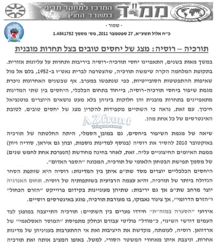 Сканы из секретного документа Центра политических исследований МИД Израиля (MAMAD) об отношениях России и Турции, оказавшегося в распоряжении AZfront.