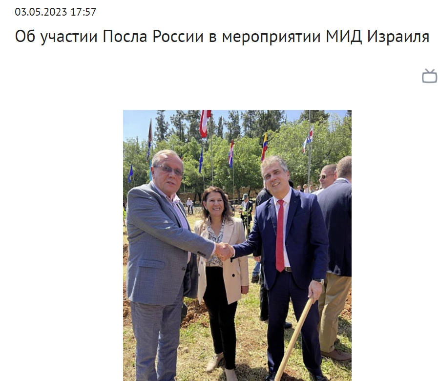 3 мая сайт российского дипломатического ведомства сообщил об участии посла РФ в Тель-Авиве Викторова «в мероприятии МИД Израиля», и разместил его совместную фотографию с министром иностранных дел Коэном.