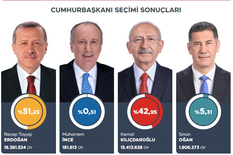 Пойдет ли голосование на второй тур (если да, то он состоится 28 мая) или победитель будет объявлен в первом все больше зависит от голосов турецкой диаспоры и результатов снявшего свою кандидатуру Индже, чьи голоса, согласно избирательному законодательству Турции, распределятся равномерно между другими кандидатами. Ранее, 13 мая, Высшая избирательная комиссия страны (YSK) приняла решение о том, что голоса Индже будут считаться действительными.