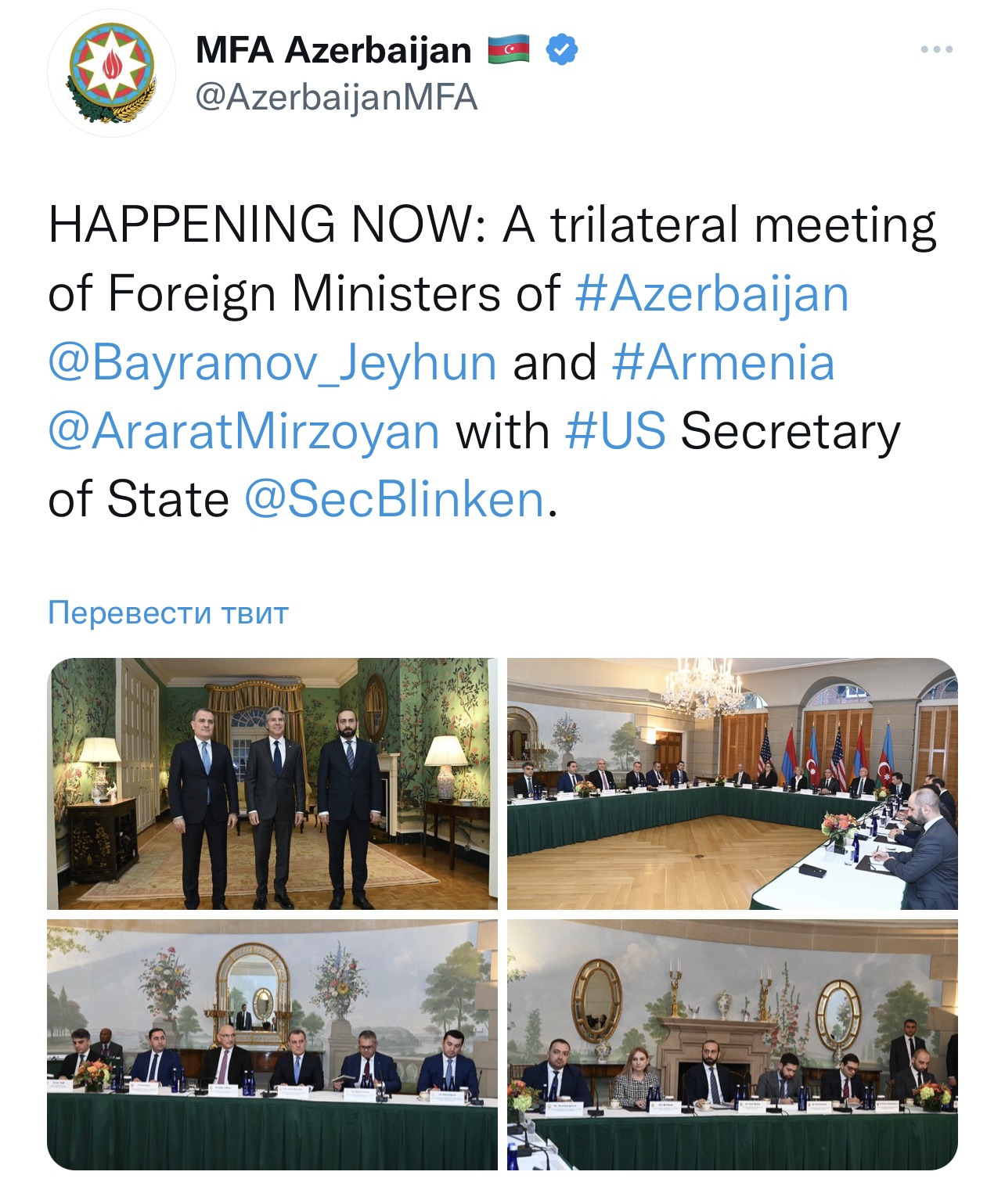 Прямо сейчас в Вашингтоне проходит трёхсторонняя встреча госсекретаря США с главами МИД Азербайджана и Армении (Twitter МИД АР).