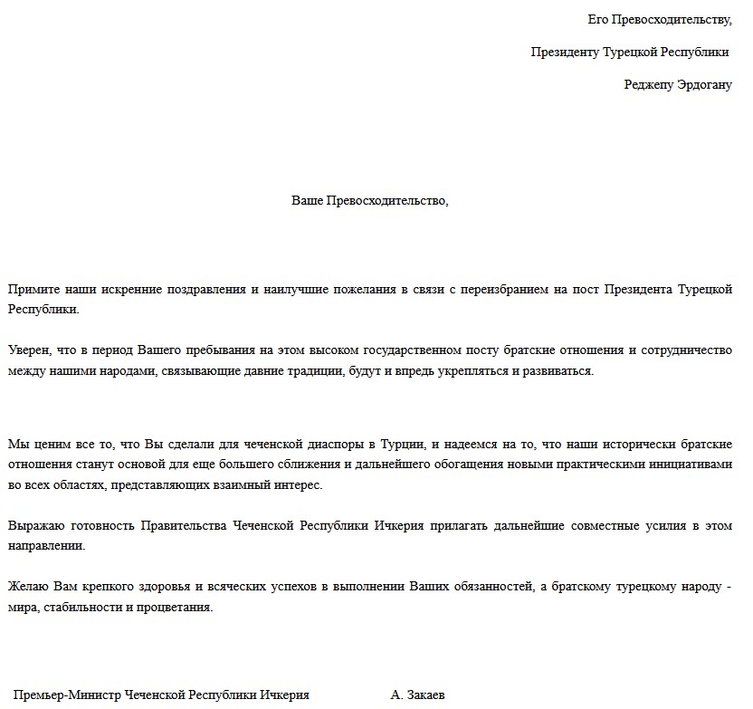 Глава правительства Чеченской Республики Ичкерия в изгнании Ахмед Закаев поздравил Эрдогана с победой на выборах. Закаев поблагодарил его за поддержку чеченской диаспоры в Турции и выразил надежду на сближение и сотрудничество.